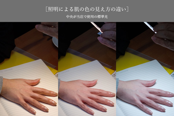 この問題は、パーソナルカラー診断においても当然同じ。本当のお客様の肌の色、髪の色、ドレープの色が正しく見えていないのでは、「一体何の診断をしているのですか?」ということに。私たちのように色を扱う専門業種では、照明に対する配慮は当たり前に行うべきものなのですが、実際にはほぼ対策が行われていないのが現状なのです。高額な診断を何度受けても解決しない方の原因は、こういう根本的なところもとても多いのです。