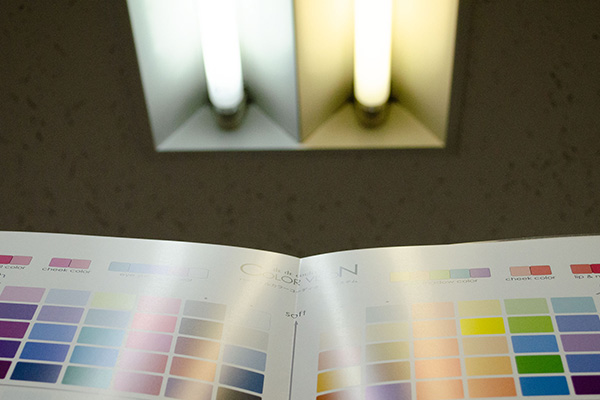 色の判断を迷わせる最大の原因は「光や色を見る条件」にあります。判断の基準となる適切な照明環境(標準光)を整えるアドバイスを行い、場所による見え方のバラつきを抑えるための土台作りをお手伝いします。